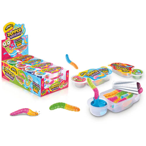 Mixed fruit flavoured gummy sweets in the shapes of worms, with a sour gel dip.
